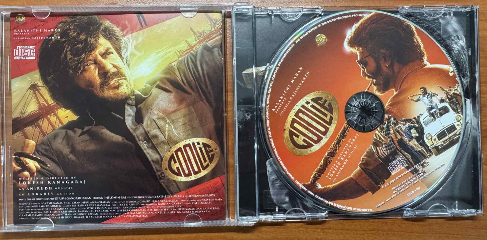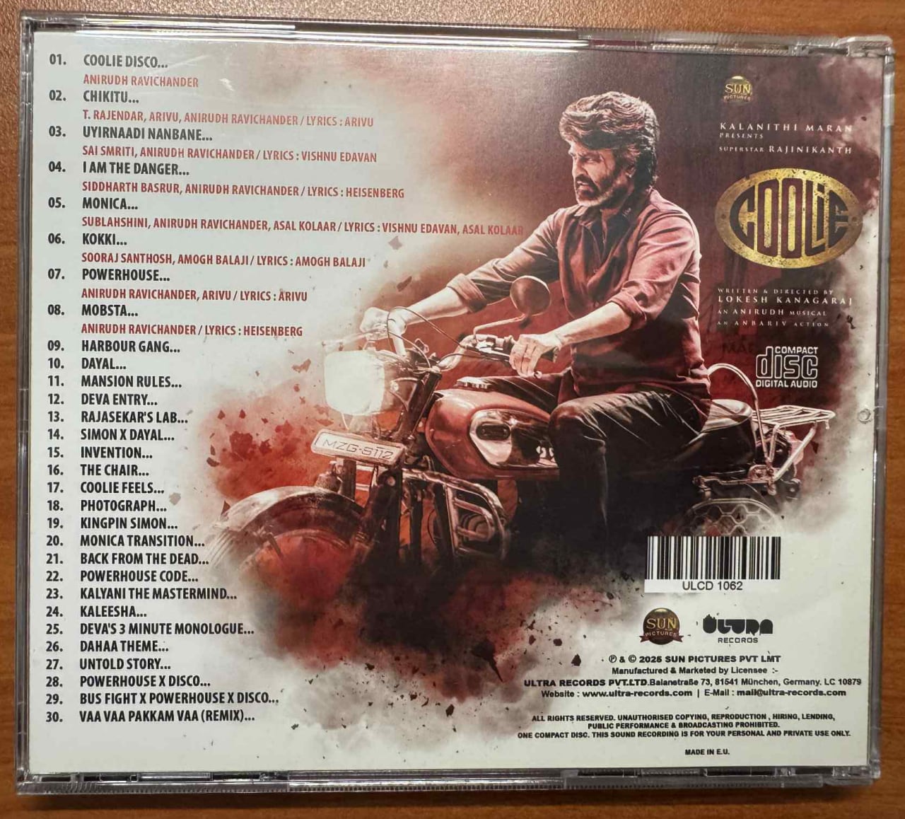 Full Length Music CD of Original Motion Picture Soundtrack from Rajnikanth's 2025 Tamil Movie Coolie. Includes 21 Background Music OST